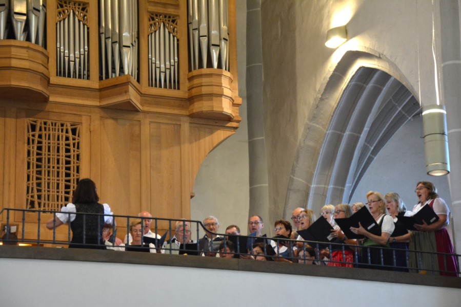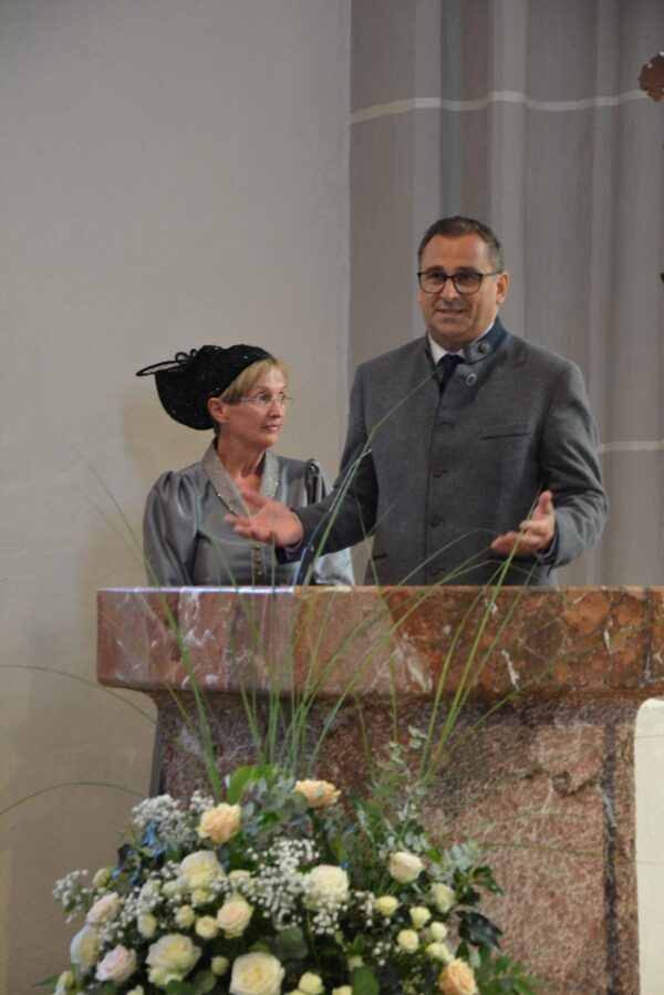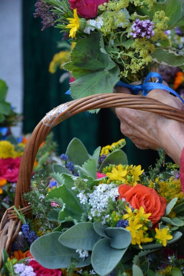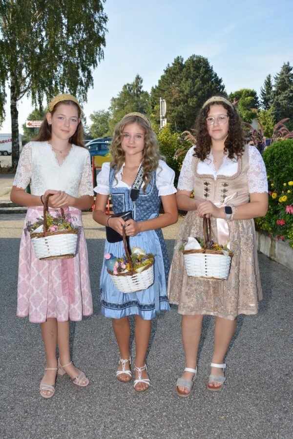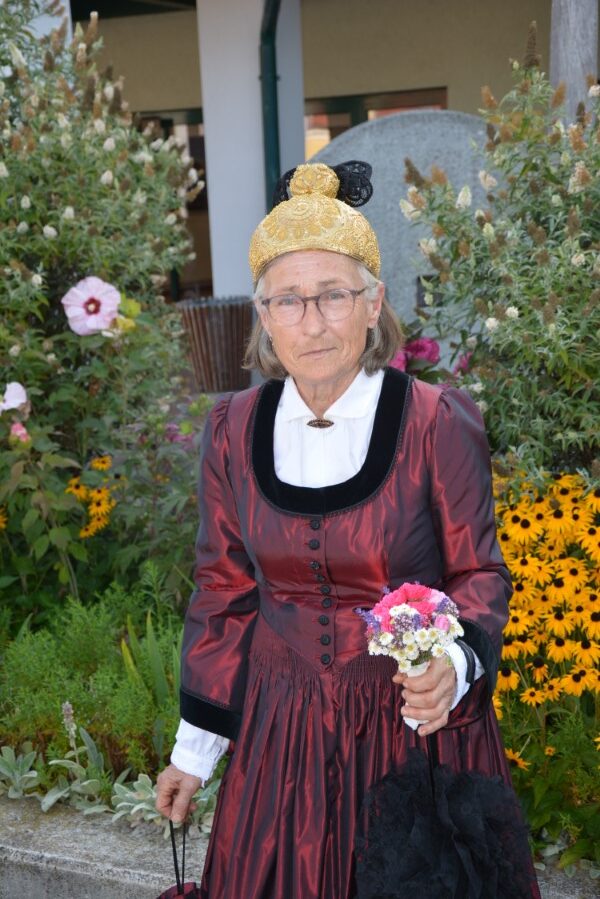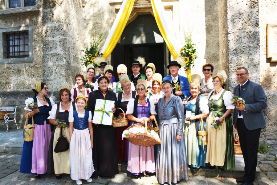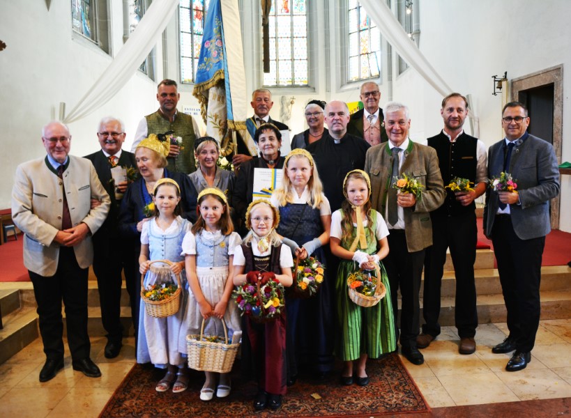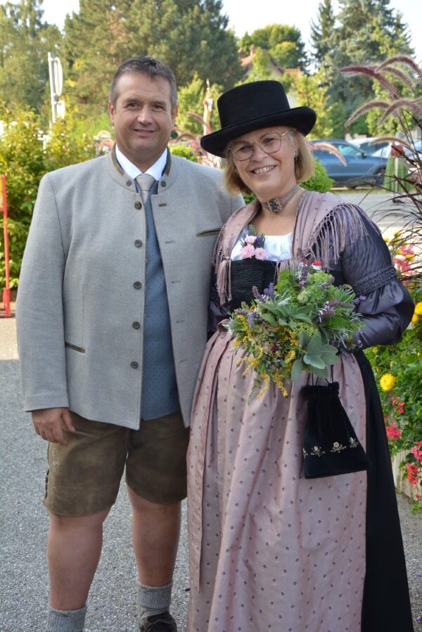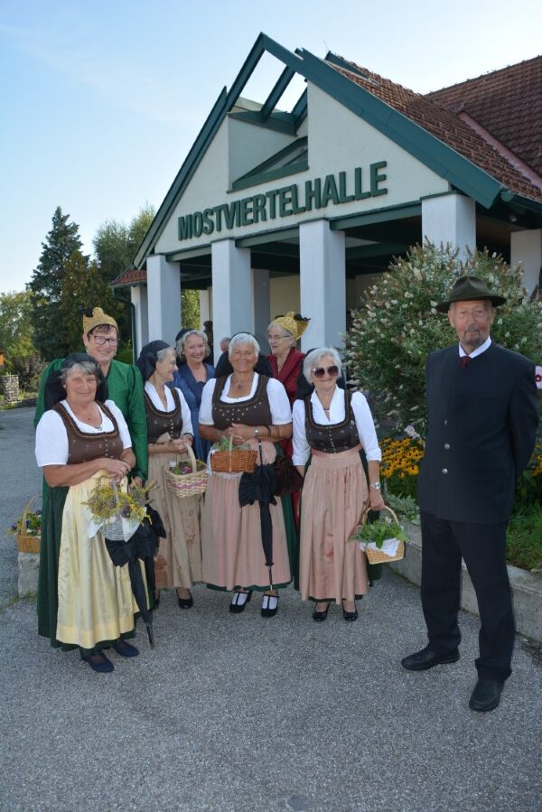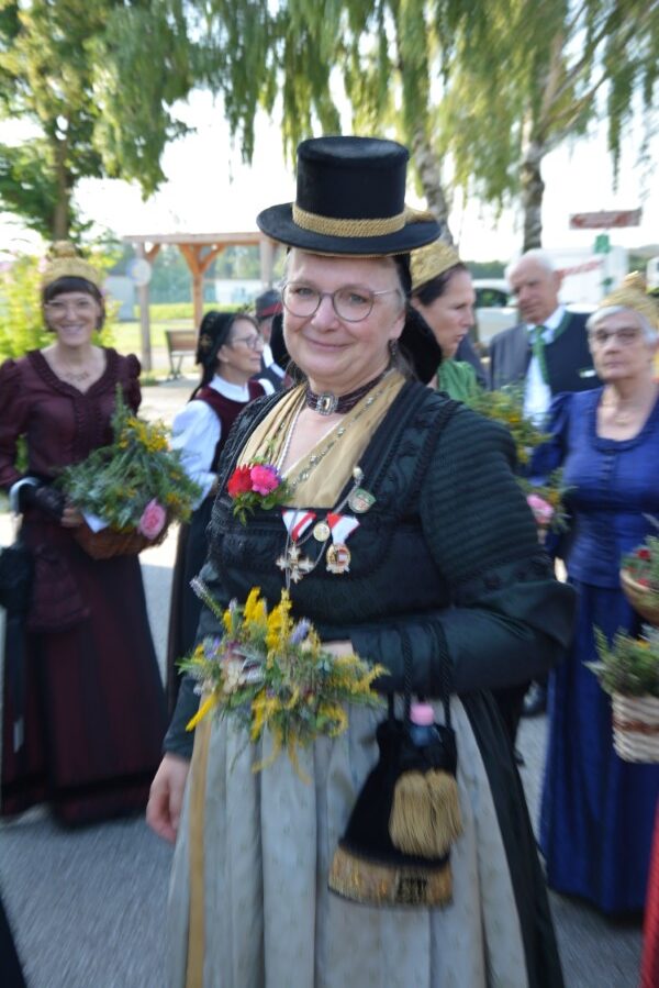Mit einer gemütlichen Agape vor der Pfarrkirche, in deren Rahmen die Wallfahrerinnen Kräutersträußchen an die Besucherinnen und Besucher verteilten, klang die Goldhaubenwallfahrt 2025 aus.