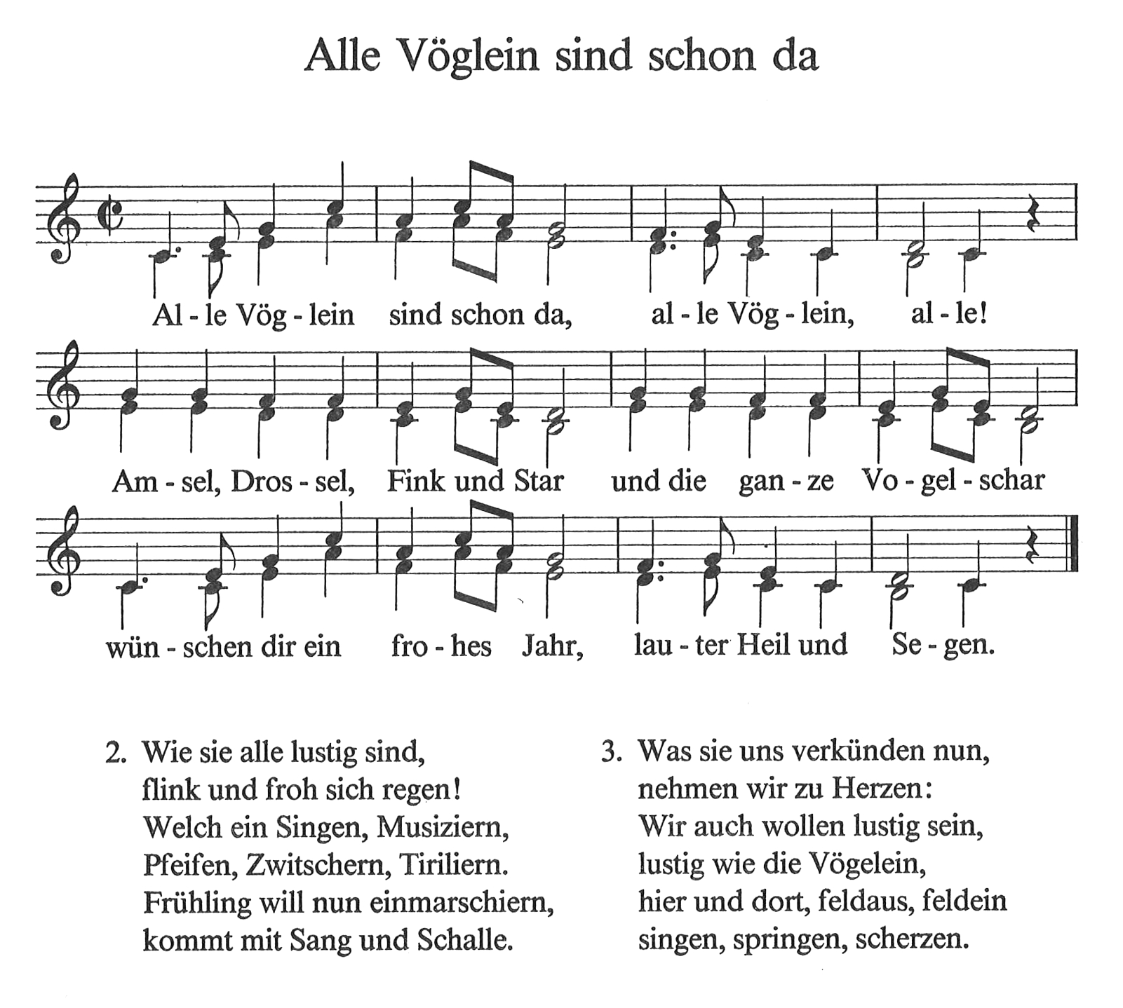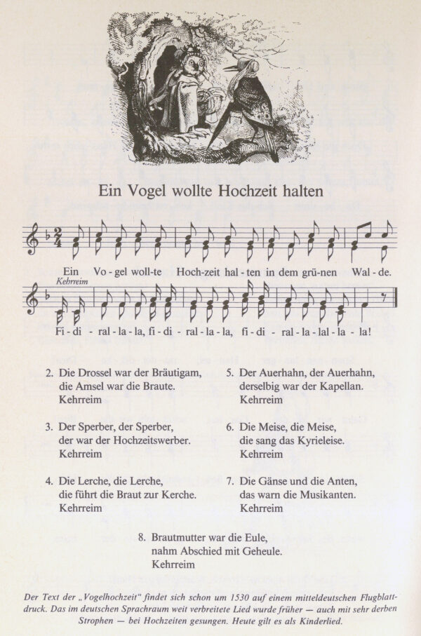 Quelle: „Die Vogelhochzeit“, Goertz/Haid, S. 158. Der Text ist bereits im 16. Jahrhundert bekannt.