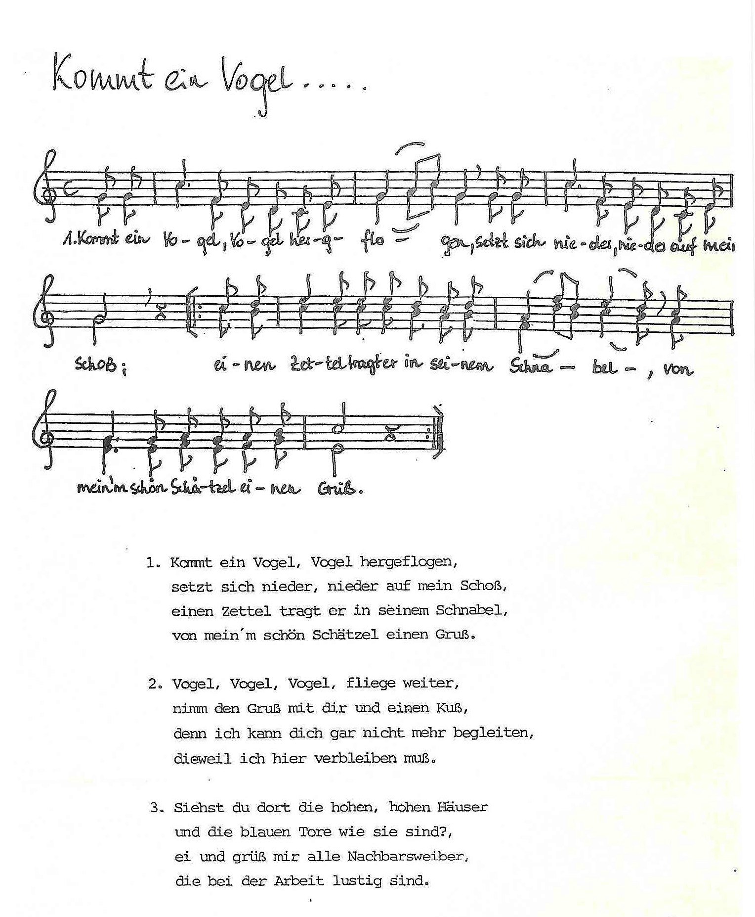 Und schließlich eine von „uns“ zurechtgesungene Melodievariante des Liedes „Kommt ein Vogel, Vogel hergeflogen“, vorgesungen von wolgadeutschen Frauen 1958. Die Originalaufnahmen befinden sich im Volkskunde-Tonarchiv von Freiburg im Breisgau.