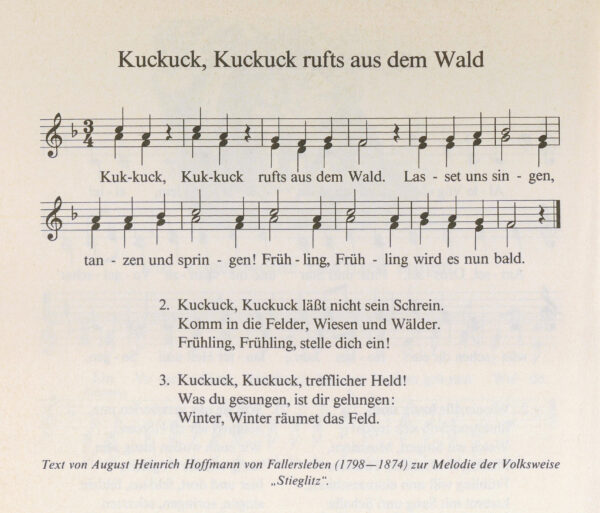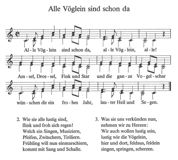 Bekannt als Schullied seit Generationen, ist das ebenfalls von Hoffmann von Fallersleben getextete Lied „Alle Vöglein sind schon da“, nach einer schlesischen Volksweise.
