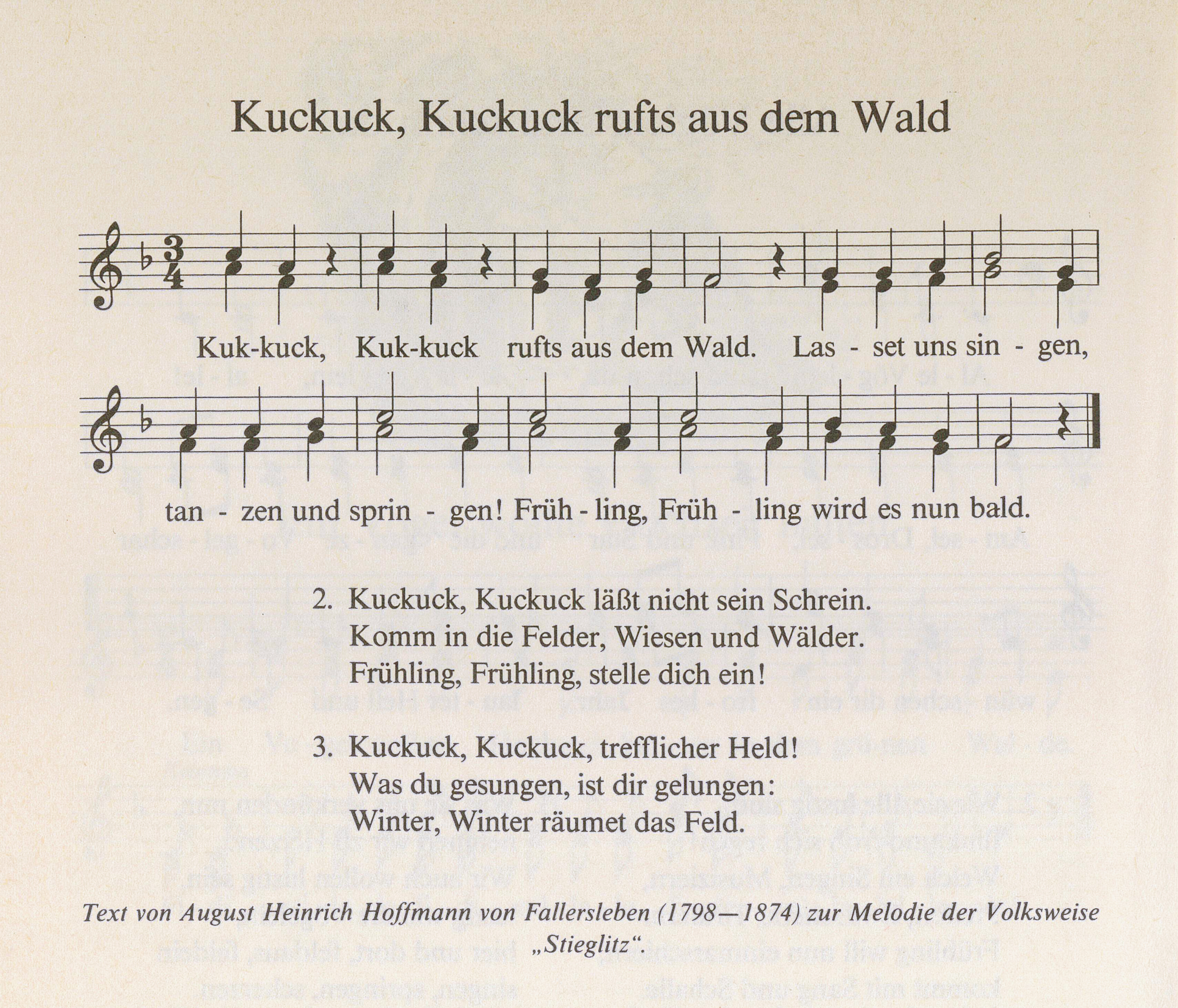 August Heinrich Hoffmann von Fallersleben (1798 – 1874) verfasste den Text nach der Melodie einer niederösterreichischen Volksweise, genau genommen ebenfalls ein Kinderlied: „Stieglitz, Stieglitz, ´s Zeiserl is krånk. Gehn ma zum Båder, låß ma eahm Åder, Stieglitz, Stieglitz, ´s Zeiserl is krånk“. In der zweiten Strophe heißt es: „Stieglitz, Stieglitz, ´s Zeiserl ist krånk. Reiß ma eahm a Federl aus, måch ma eahm a Betterl draus, Stieglitz, Stieglitz, ´s Zeiserl is krånk“. (Worterklärungen: 1. Båder. Arzt der kleinen Leute. 2. Åderlaß bedeutet Blutabnahme aus der Vene. 3. Mit dem Zeiserl ist der gelbgrüne Erlenzeisig gemeint, ein Singvogel, der zur Familie der Finken gehört.)