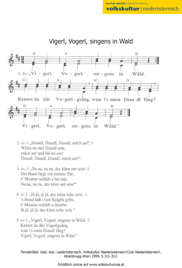 Informationen zu Liedern, Liederbüchern und Noten erhalten Sie im Volksliedarchiv der Volkskultur Niederösterreich. www.volkskulturnoe.at