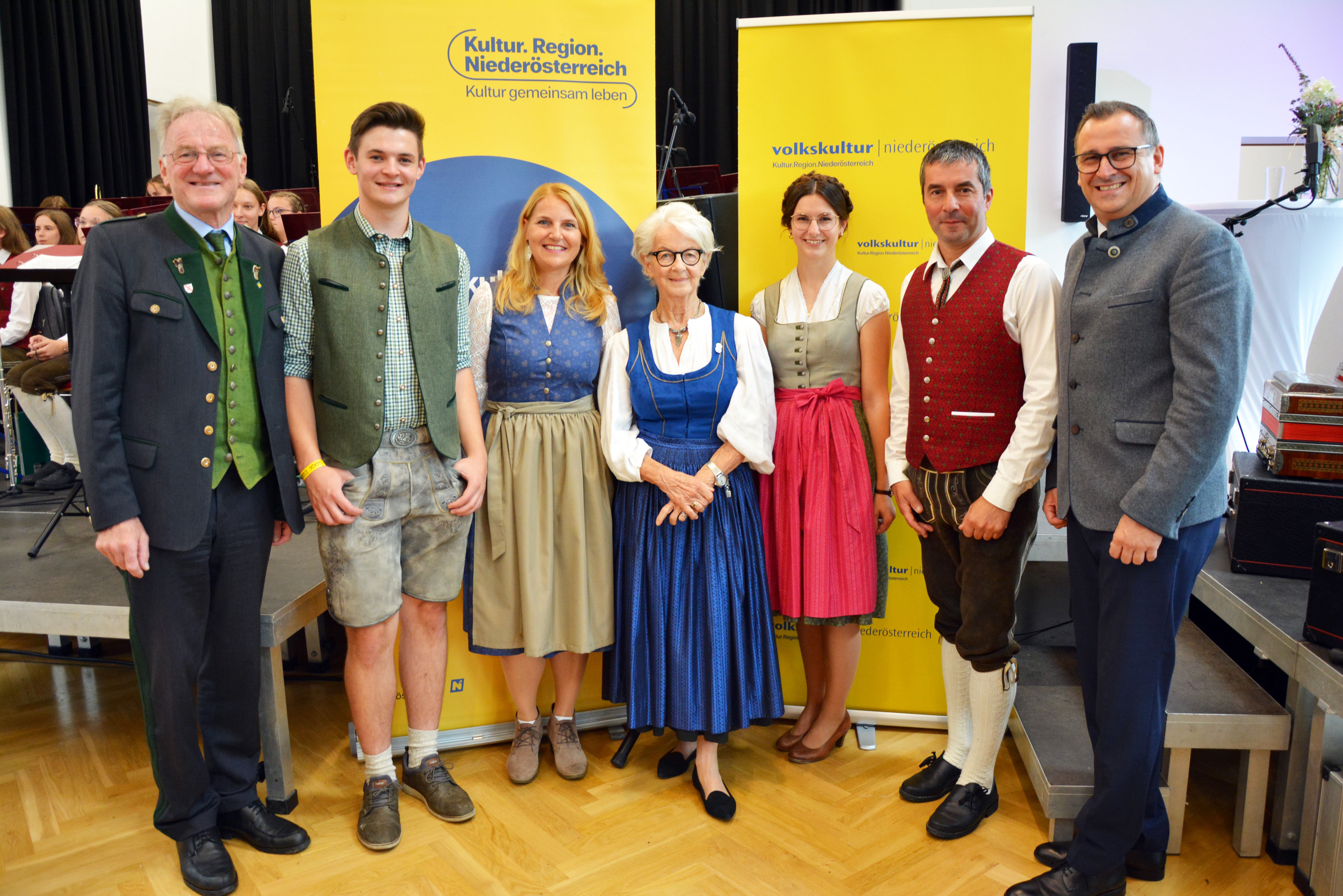 Bürgermeister von Göstling an der Ybbs Friedrich Fahrnberger, Thomas Teufel von den Ötschermugln, ORF NÖ Moderatorin Birgit Perl, Goldhaubenfrau Marita Teufl, Schneidermeisterin Theresa Klapf, Hubert Teufel vom Musikverein Göstling an der Ybbs und Harald Froschauer, Geschäftsführer der Volkskultur Niederösterreich, beim ORF Radio NÖ Frühschoppen anlässlich des landesweiten Dirndlgwandsonntags in Göstling an der Ybbs.