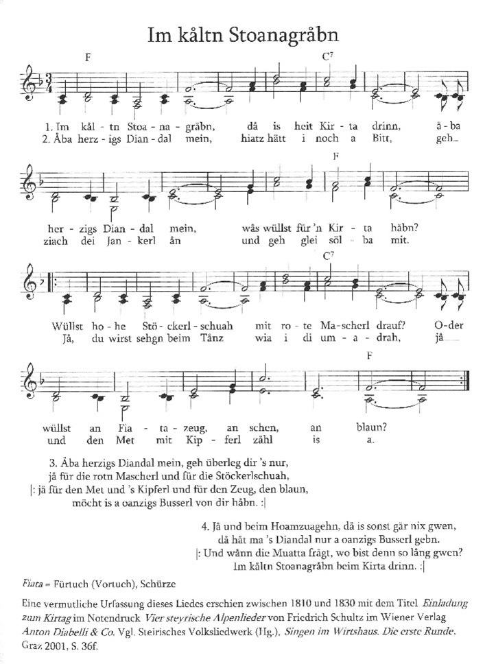 Das überlieferte und unterhaltsame Lied vom „Stoanagråbn“ bezieht sich in seiner ersten Strophe auf das „Fiata“
